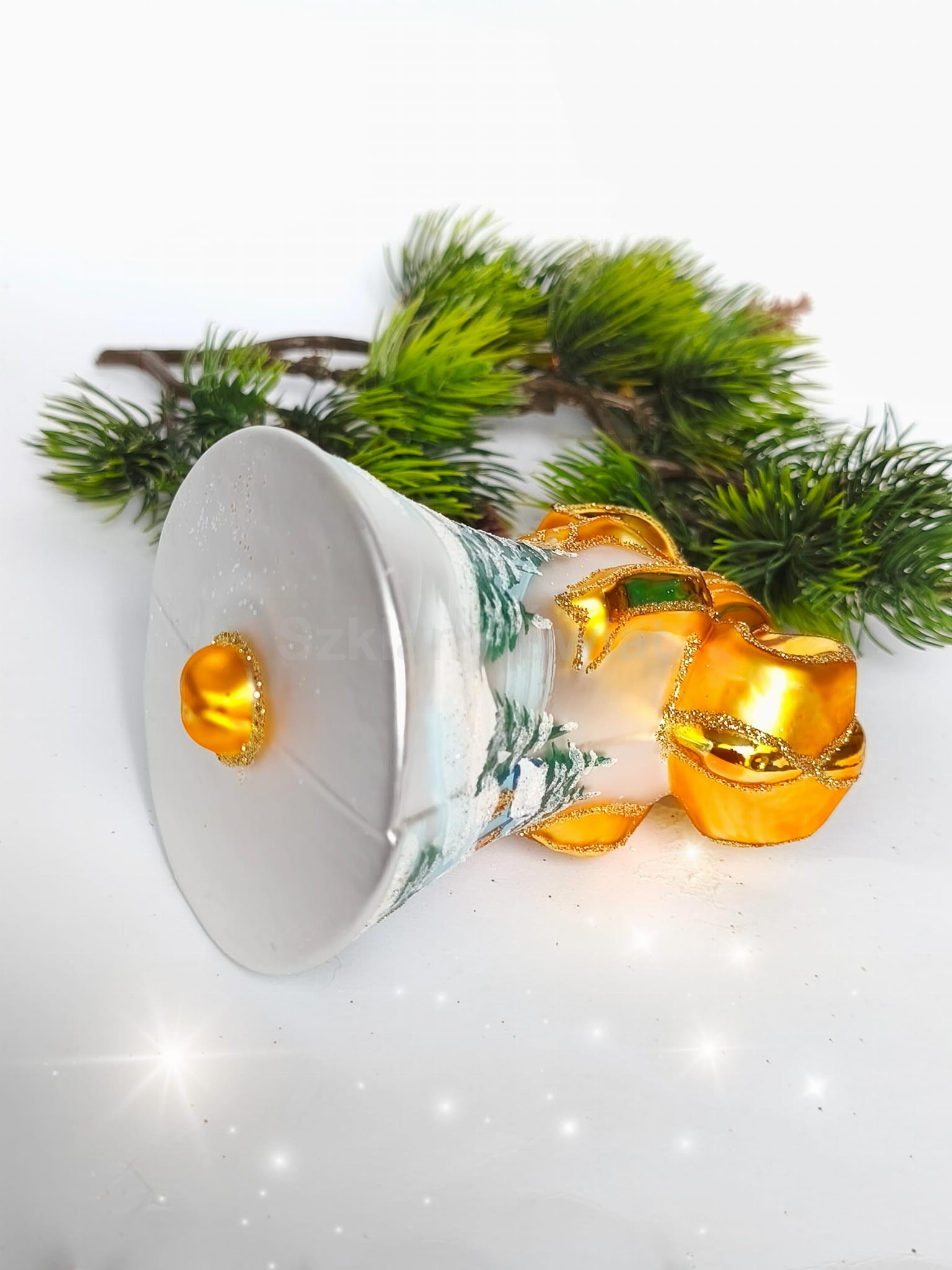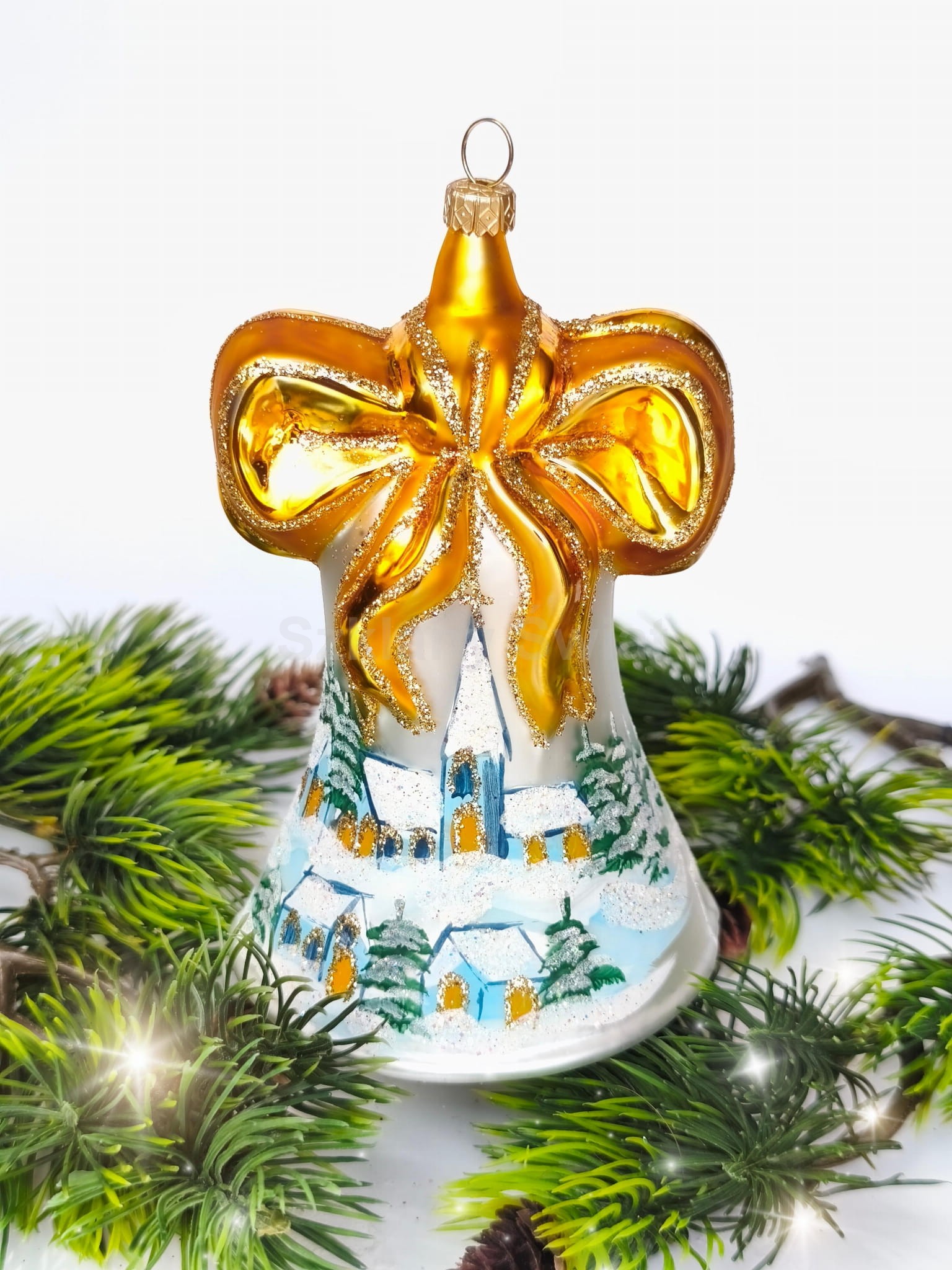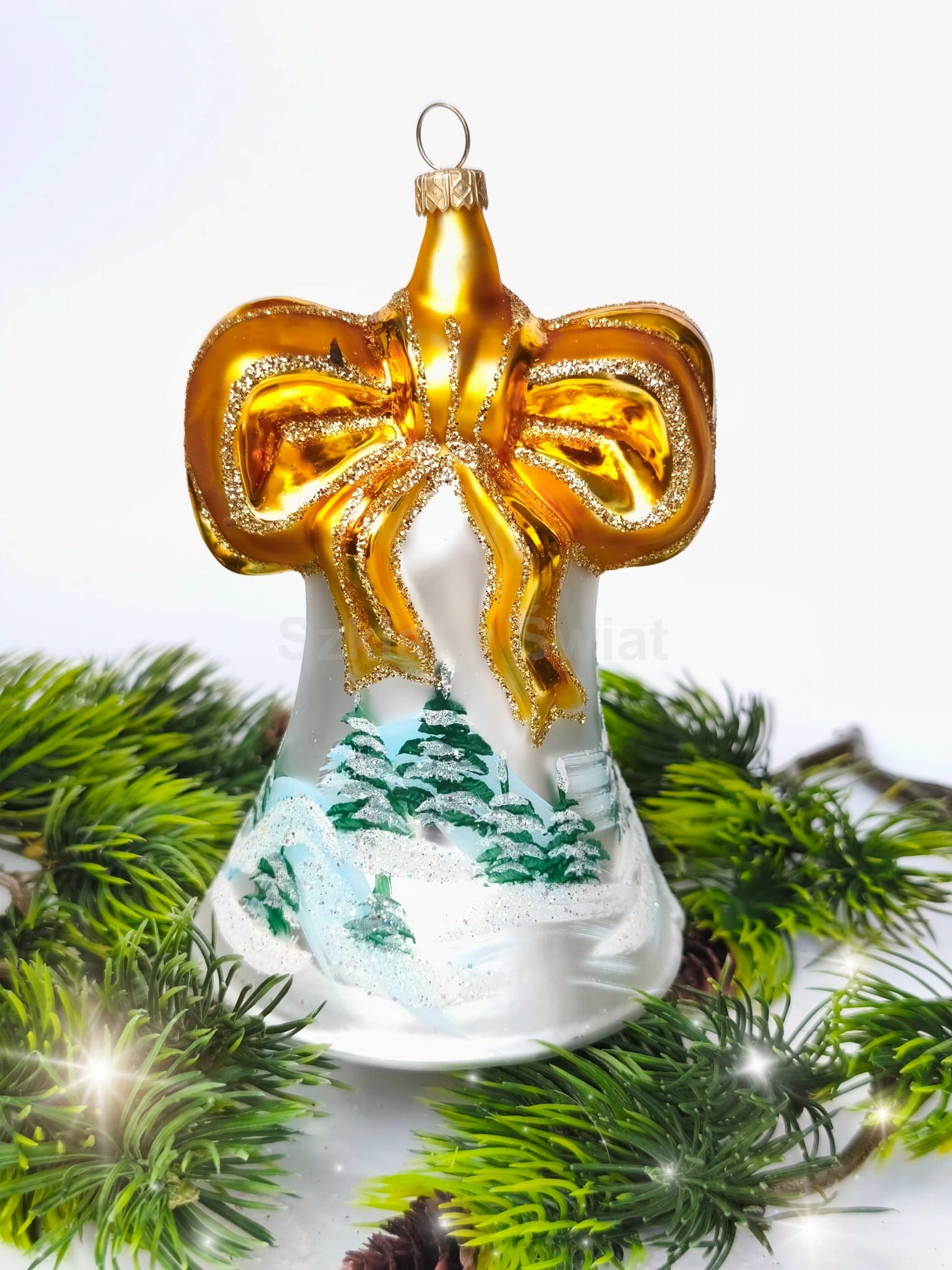 Bombka szklana, wykonana ręcznie, metodą tradycyjną, za pomocą formy. Wspaniały DUŻY dzwonek, przepiękny delikatny dekor ozdobiony błyszczącym brokatem. Nowoczesny Design. Na innej aukcji znajdziecie dzwonek z czerwoną kokardą ( patrz: zdjęcie).