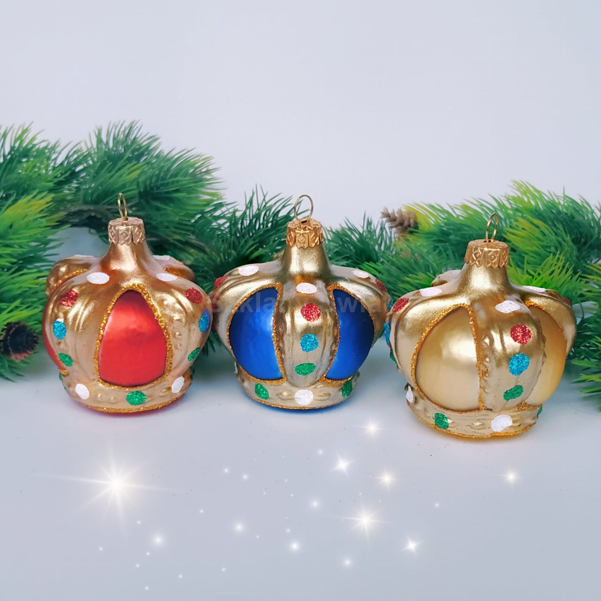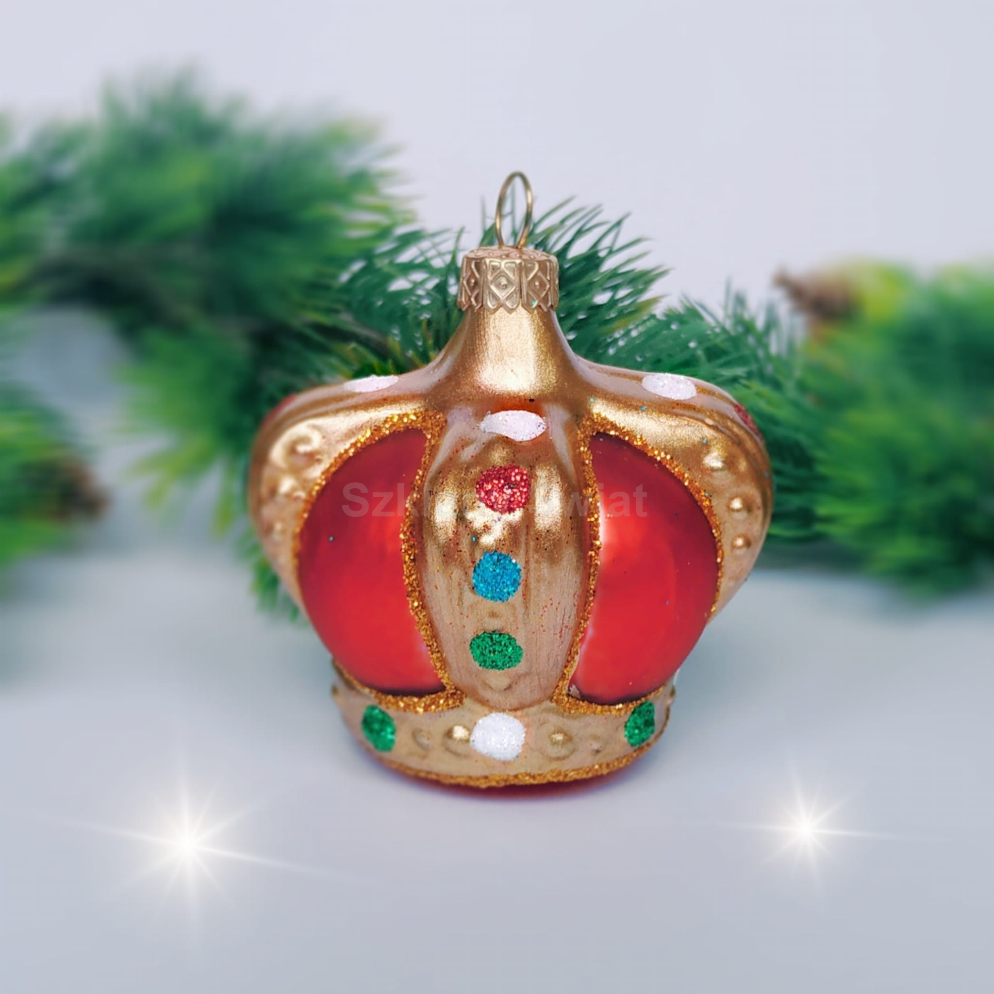 Bombka szklana, wykonana ręcznie, metodą tradycyjną, za pomocą formy. Tradycyjna korona z dawnych lat PRL-u. Bombka przywołująca wspomnienia. Inne korony znajdziecie TUTAJ: KORONA