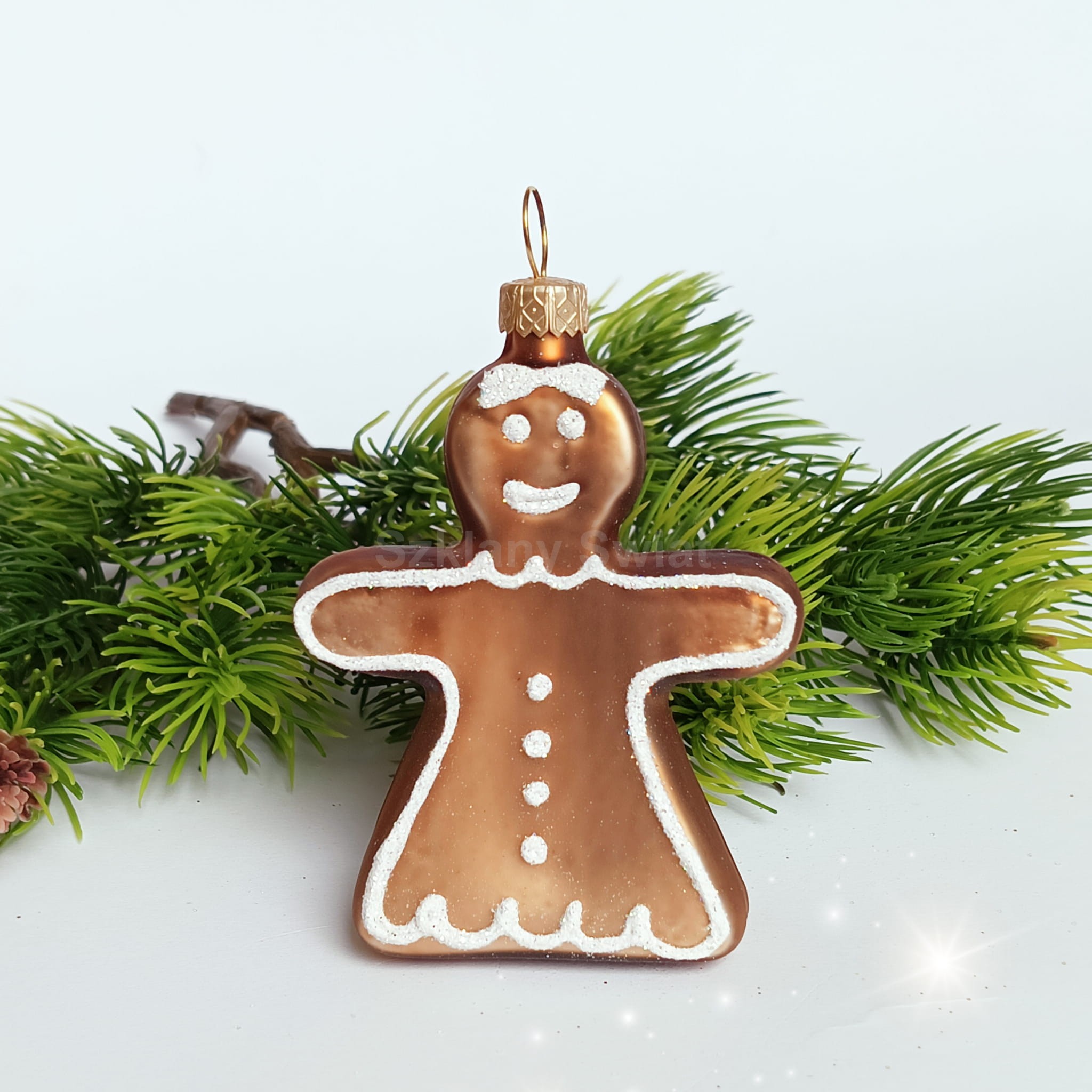 Bombka szklana, wykonana ręcznie, metodą tradycyjną, za pomocą formy. Bombka w kształcie piernika, sprawia wrażenie prawdziwego, jadalnego piernika, nie sposób, aby był niezauważony na choince. Zdobienia posypane białym brokatem- irysem.